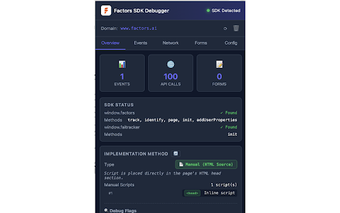 Verktyget har flera användbara flikar som ger en översikt över SDK-status, fångade händelser samt detaljerad information om nätverksanrop och formulärinlämningar. Med realtidsuppdateringar och möjligheten att inspektera globala objekt och relaterade cookies, är Factors SDK Debugger ett värdefullt verktyg för intern utveckling och övervakning av SDK-implementationer.